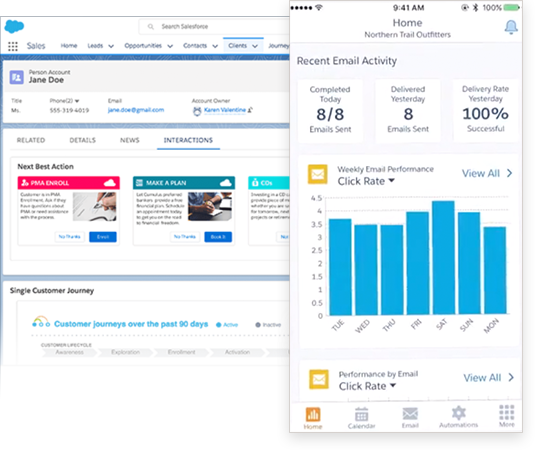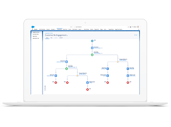 Met Pardot en Marketing Cloud maak je geautomatiseerde customer journeys, wat inhoudt dat content die je klanten of prospects te zien krijgt zijn aangepast op het gedrag wat ze vertonen, zoals het klikken van links, het versturen van formulieren of het openen van e-mails.